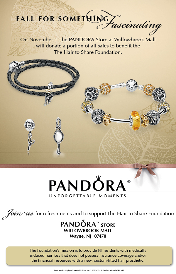 On November 1, 2014, PANDORA at the Willowbrook Mall will donate a portion of the all sales to benefit The Hair to Share Foundation which provides a community effort to address the hardship caused by cancer treatment, or other medical conditions causing hair loss, that is often overlooked: the struggle to maintain one's identity.